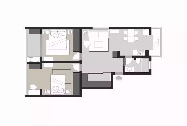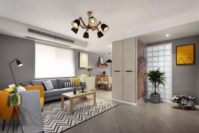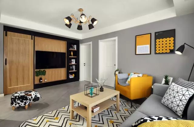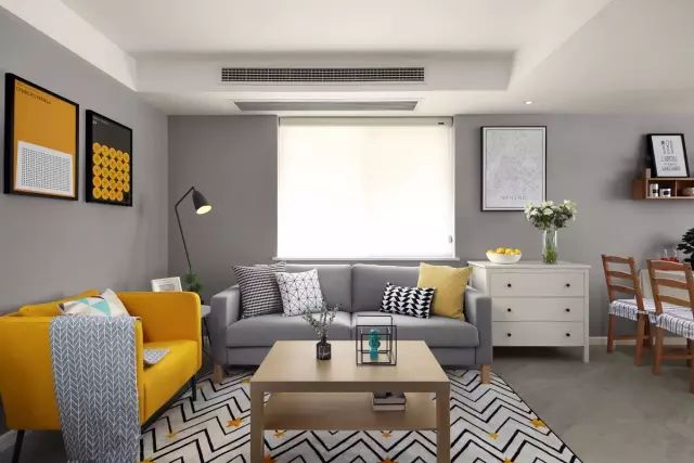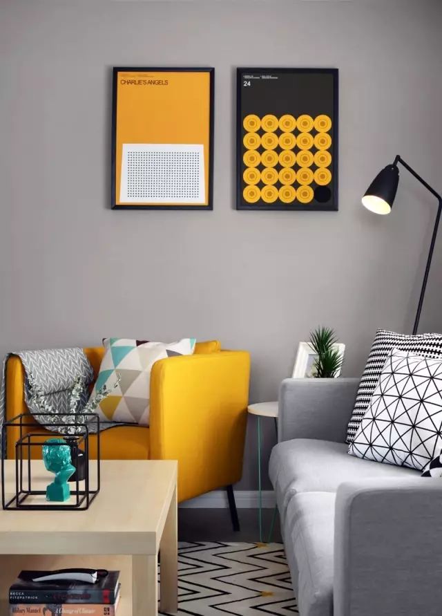 ▲现在是客厅空间,灰色的乳胶漆奠定安静的氛围,而随着些许跳脱的黄色融入,会客区瞬间变得活泼了起来。