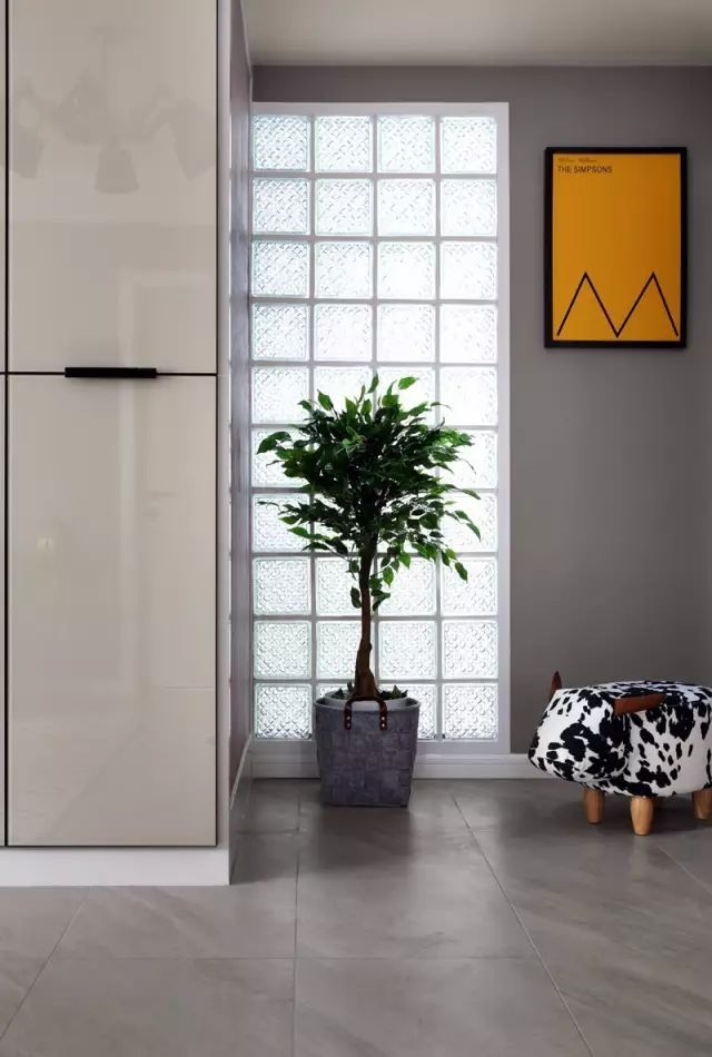 ▲玻璃砖的运用让门厅和卫生间互相借光,阵列组合方式也和整体风格协调。